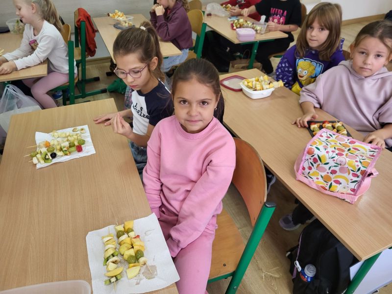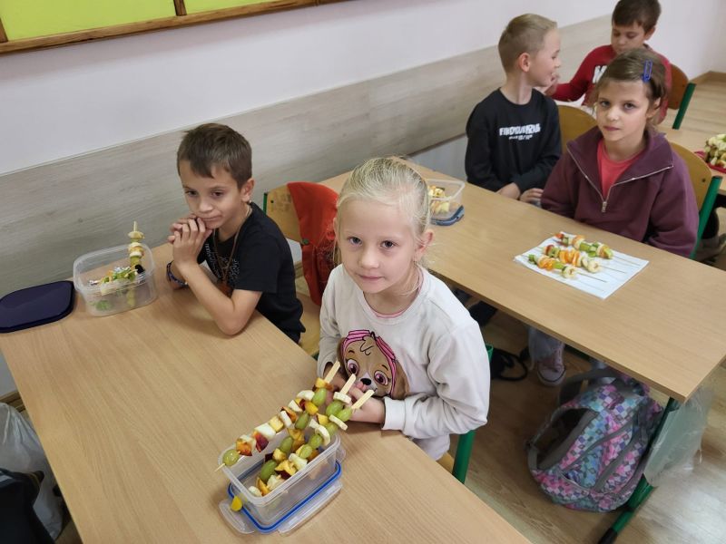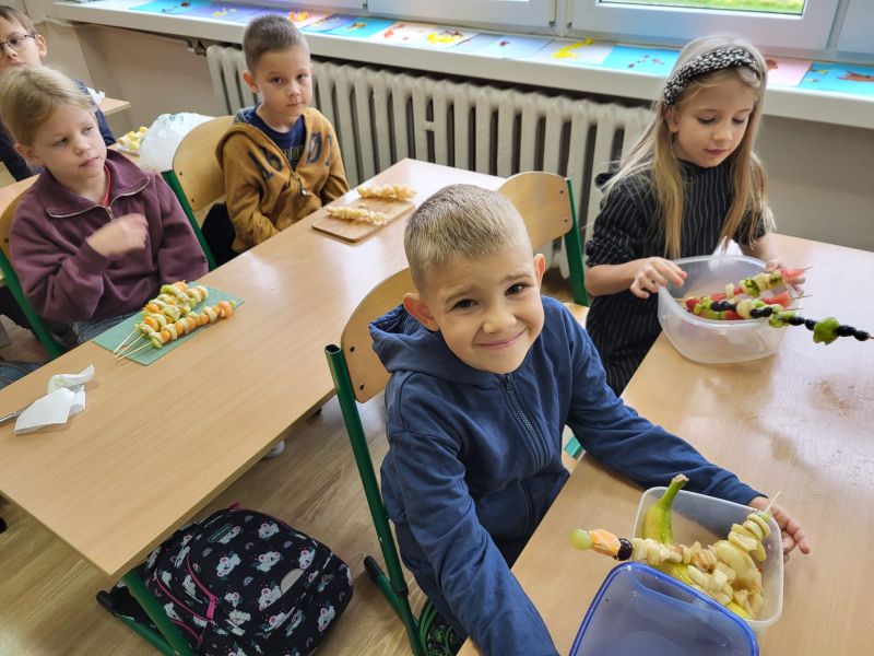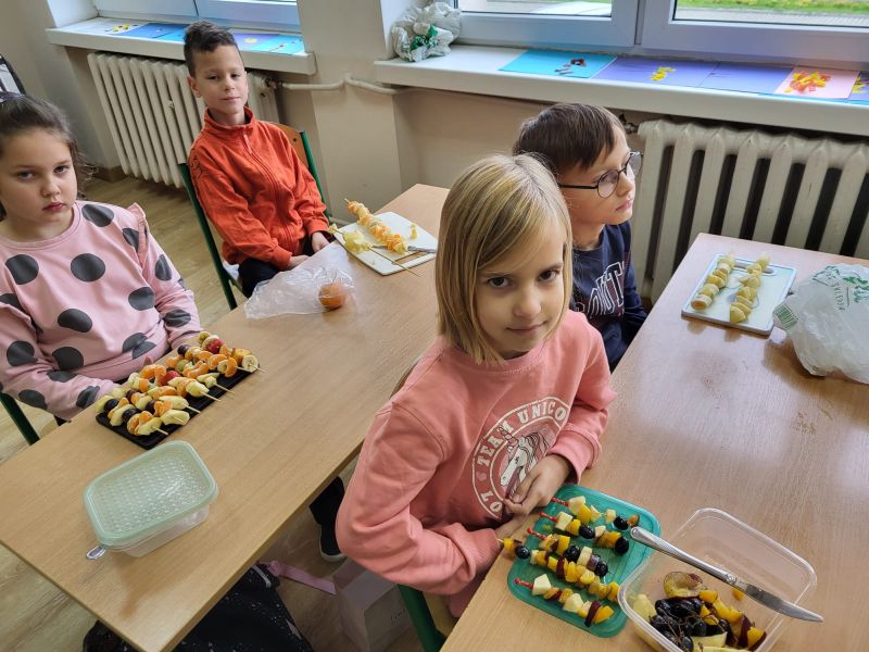 a najlepszym sposobem na przekonanie uczniów do spożywania owoców są działania praktyczne. Uczniowie klasy I zrobili pyszne owocowe szaszłyki. Była to również okazja do porównywania wyglądu i smaku wybranych owoców krajowych i zagranicznych.