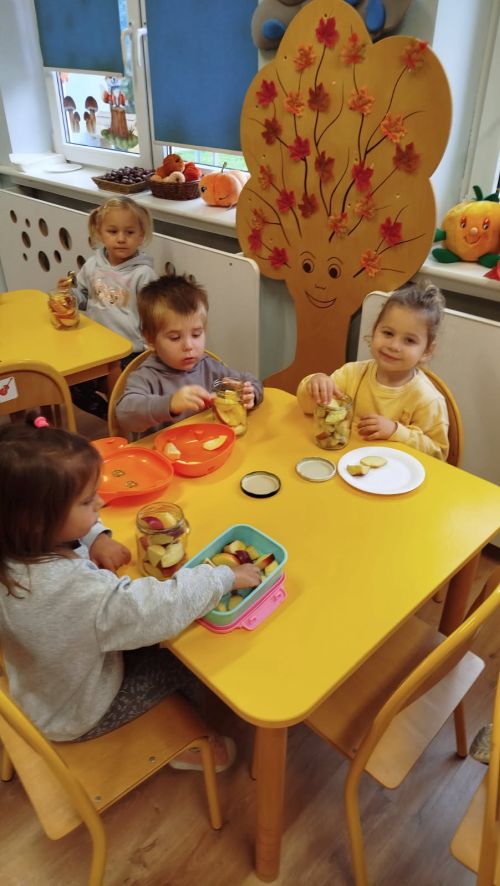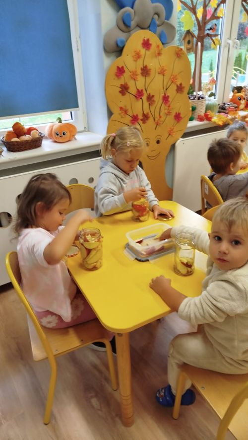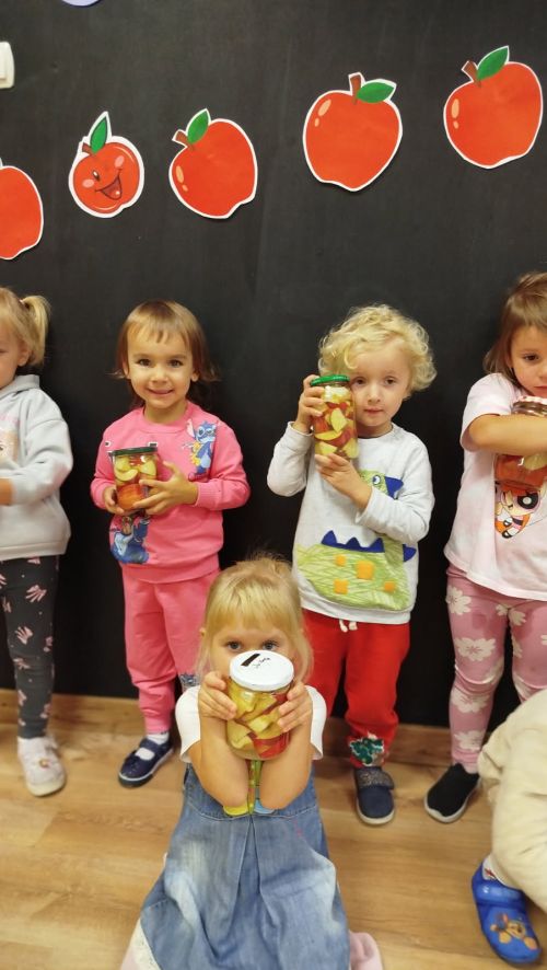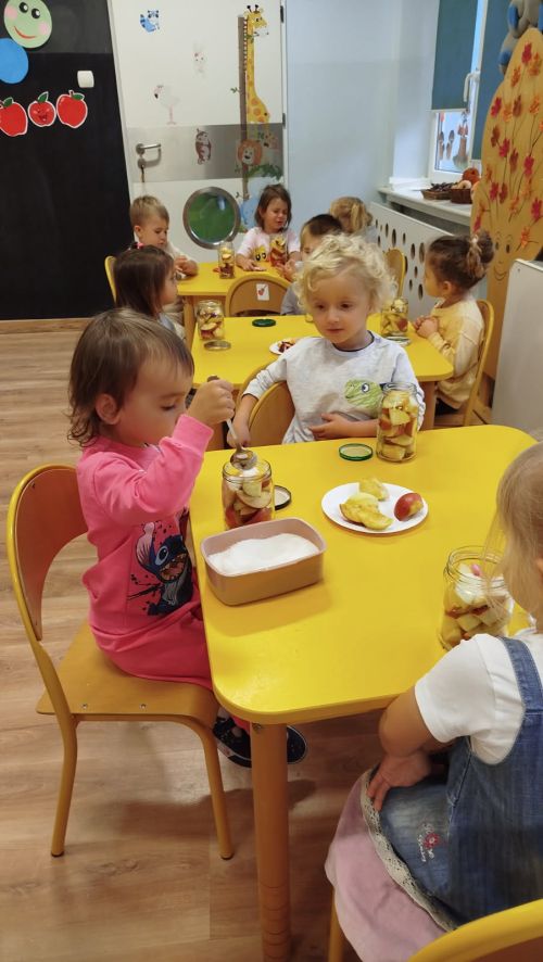 Z wielką starannością wkładały ćwiartki jabłek do słoiczków, zalewały wodą oraz dodawały cukru. Na koniec smakowaliśmy pyszne racuszki z jabłkiem. Wszyscy z pewnością zapamiętają, że jabłka są pyszne i zdrowe!