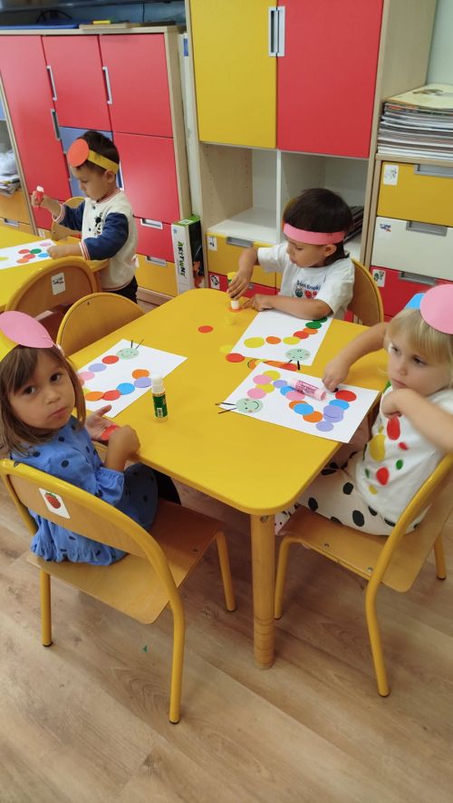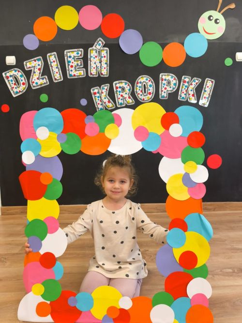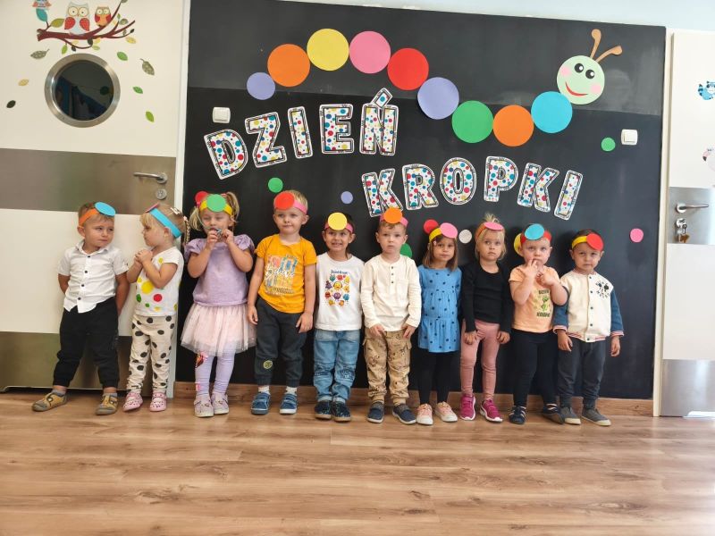 Najmłodsza grupa przedszkolna świętowała na początku roku przedszkolnego Dzień Kropki. Kropki pojawiały się w tym dniu wszędzie: podczas zajęć, w pracach plastycznych oraz w trakcie smacznego poczęstunku. Na koniec można było sobie zrobić pamiątkowe zdjęcie w „Kropeczkowej fotobudce”. Z kropkami bawiliśmy się wspaniale!