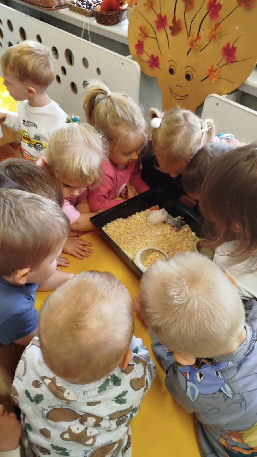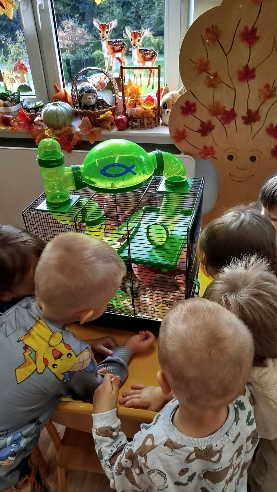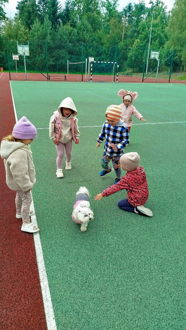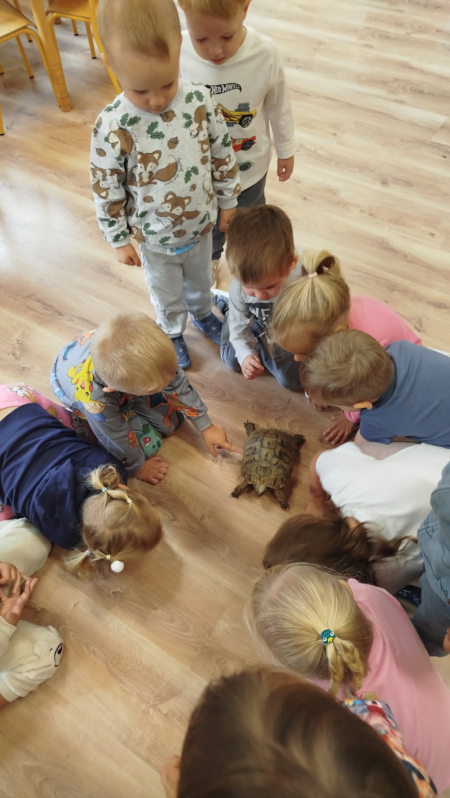 Dnia 6 października gościły w naszej grupie zwierzęta: pies, chomik, myszoskoczek i żółw. W ten sposób świętowaliśmy Dzień Zwierząt. Dzieci cały czas ze szczególną troską opiekowały się „gośćmi”, karmiły i głaskały zwierzątka. Nie zabrakło też wspólnej zabawy - szczególnie z pieskiem.